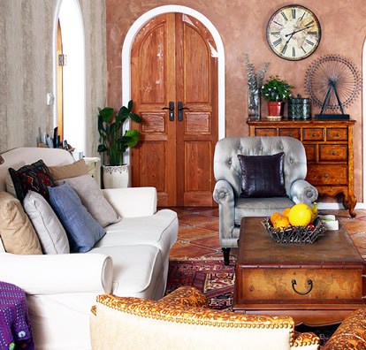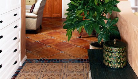 地面的鋪裝也是亮點(diǎn)之一。客廳的大塊褐色意大利手工地磚與色彩絢麗的土耳其羊毛地毯交織出質(zhì)樸而溫暖的氛圍,在客廳與餐廳交接處,姜楠還以方格紋的褐色地磚來(lái)作為銜接與過(guò)渡,使客廳和餐廳以地材為界,既相互獨(dú)立,又隱為一體;廚房采用是產(chǎn)自泰國(guó)的牛皮色仿皮地磚,無(wú)論質(zhì)感和色彩,都與真正的牛皮頗有幾分相似;玄關(guān)的地磚則花色更為精致;尤其是浴室的地面,姜楠更是將混搭精神發(fā)揮到了極致。小小空間內(nèi)共采用了五種不同的素材,有意大利的,也有國(guó)產(chǎn)的,營(yíng)造出強(qiáng)烈的裝飾效果——在不同花色的地磚、馬賽克的包圍下,浴室仿佛融入了陽(yáng)光與活力,散發(fā)著濃郁的西班牙氣息。