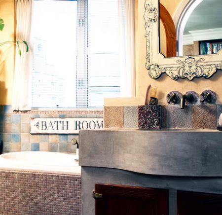 繁簡(jiǎn)交錯(cuò)的洗浴空間浴室的地面、墻面用的磚、馬賽克,加起來(lái)共有五種不同的花色,讓浴室的肌理和層次都極為豐富,而洗手盆卻匠心獨(dú)具地用純水泥手工制作,再配上厚樸的木櫥柜門(mén),一豐富一簡(jiǎn)約,一熱情一拙樸。