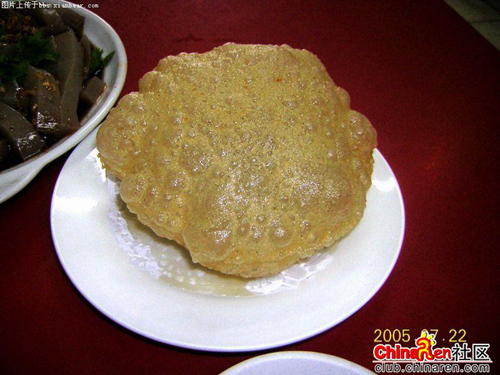 泡泡油糕色澤乳白,表皮蓬松,猶如輕紗織就,蟬翼作成,可謂巧奪天工。它之所以受到人們的青睞主要是因?yàn)樗闹谱鞣椒ㄓ兄?dú)到之處。平時(shí)人們吃的油條油餅蓬松發(fā)虛主要是因?yàn)殁C堿和面粉的配比恰當(dāng),放入熱油中所產(chǎn)生的二氧化碳?xì)怏w膨脹所致。而泡泡油糕既不放釩也不施堿,只是利用大油和水燙面,同樣蓬松漲發(fā)。它要求糕餅師一定要具有高超的技術(shù)和豐富的經(jīng)驗(yàn),大油、水、面的比例一定要恰倒好處,對(duì)油溫的要求也很嚴(yán)格,當(dāng)油糕投入到一定 溫度的油鍋內(nèi),內(nèi)部水蒸氣大量形成,氣體急劇上升的同時(shí),蛋白質(zhì)性變而展開(kāi),淀粉膨脹焦化,氣泡逐漸形成,并在高溫環(huán)境中固定下來(lái),要求出鍋的油糕不落架(不蔫不癟)。 |